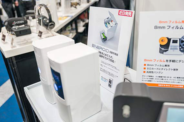 またその隣には、電池の自動充電装置「ENEROID」が展示してあった。これの優れたところは、電池の極性を無視して放り込んでおくだけで後は勝手に充電してくれるところ。通常のアルカリ電池などは充電せずに排除してくれる機能が付いているから本当に便利だ。実際、ロケ後のホテルではただひたすらに充電に時間が取られることが多い。眠い目を擦りながら充電をするよりは、こうした装置で一気に充電を済ませたいものだ。
