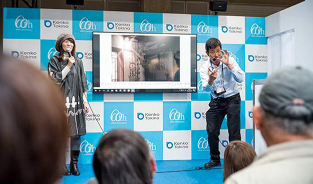ケンコー・トキナーブースのご紹介の最後に流石はケンコー・トキナーと言うシーンをお見せしたい。それは、ブース内にセミナーコーナーがあって、そこでは初心者レベルからの道具の使い方を説明していたことである。どうしてもCP+のセミナーは派手なハイエンドセミナーになり勝ちで、地に足の付いたセミナーは小数である。そんな中、フィルターを付ける順番から教えるこのセミナーは、学生以来久々に写真に戻ってきたリタイヤ組などにばか受けで、常に人が絶えなかった。こういう活動こそメーカーにしかできないことだと思うので是非今後とも続けて欲しいところである。