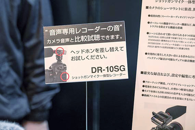 ちなみに展示内容は、どれも最新のもので非常に興味深かった。例えばPanasonicコーナーではVARICAM LTが実機展示されて実際に触ることが出来たし、またティアックのコーナーでは、TASCAMの小型マイクレコーダーDR-10SG等を展示して、注目を集めていた。DR-10SGはショットガンを搭載していて、さらに音をラインで流すこともそこに1KHz信号を出すことも出来るため同期も容易で、大変便利に使えるレコーダー付きマイクだ。