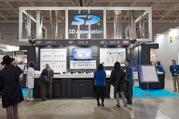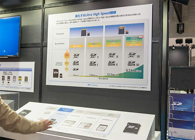 普段の展示会では枯れ木も山の、と言う感じのSDカード公式ブース。こちらのブースは皆さん見られただろうか?実は今回CP+の目玉の一つがこのブースだったのだ。ついにUHS-III規格の誕生がSDカード公式ブースで告げられていたのだ!
