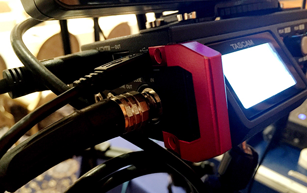 演者にラベリアマイクなどをつけてワイヤレス送信する時に、電波の状況によって途切れるのが一番心配な部分だが、これはマイクと送信機の間に割り込ませて使うため、音声が途切れてもそのまま収録出来る。大きさは写真の通り非常にコンパクト。