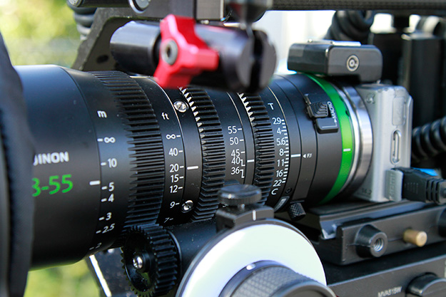本当はα7系で組むと良いのかも知れないがこのレンズはS35センサー(又はAPS-Cサイズ)に併せてあるので、敢えて小型のミラーレスでの現場を想定しての組み込み。本当はα6500辺りで組み込みたい所だが、今回は手持ちのNEX-5Rで。今更感がする機材だが使い方によってはまだまだ現役で十分行けるカメラでもある。組合せ的にはEVFと外部レコーダー(SAMURAI BLADE)を組んでProres収録という想定。バランス的にも全く問題ない。このレンズならワンマンオペで行くはずなのでフォローフォーカスは左側のみの仕様。