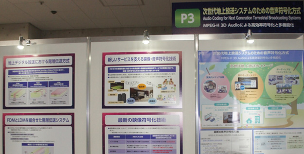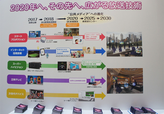 現在NHK技術研究所で行われている主な研究テーマとしてスマートプロダクション、インターネット活用技術、スーパーハイビジョン、立体テレビ、次世代デバイスがあり、それぞれのロードマップがパネル展示されていた