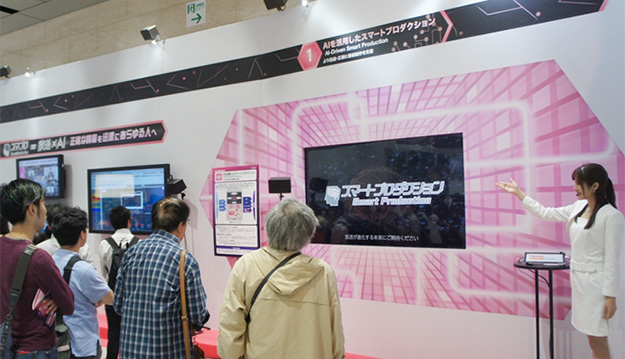 AIを活用したスマートプロダクション。放送局のノウハウや、データをAIにより解析することでソーシャルメディアや自治体などが提供するデータから番組制作に役立つ情報を取得したり、原稿を自動で生成したりする制作支援システム。手話CGや音声ガイド、やさしい日本語など、人にやさしいコンテンツへ自動変換する技術などを利用することで、幅広い視聴者に様々な情報を提供