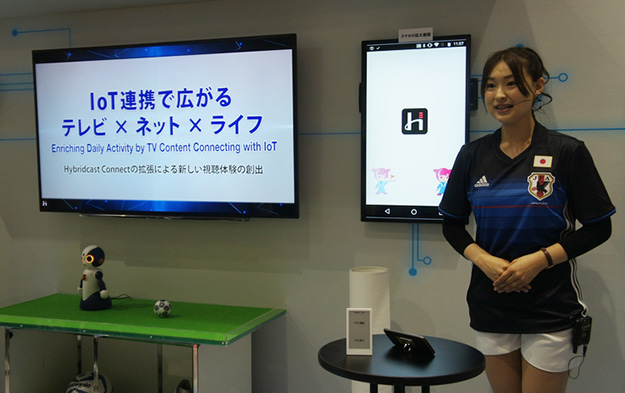 IoT連携で広がるテレビ×ネット×ライフ。Hybridcast Connectの拡張により番組提供者ごとのコンパニオンアプリを共通化することで、テレビとスマホ、IoT機器を用いた放送コンテンツを中心としたサービス連携が可能。IoT機器と連携する機能により、スマホなどのスマートデバイスに加え、ロボットなどの多様な機器を活用した新しい番組連動サービスを楽しめる