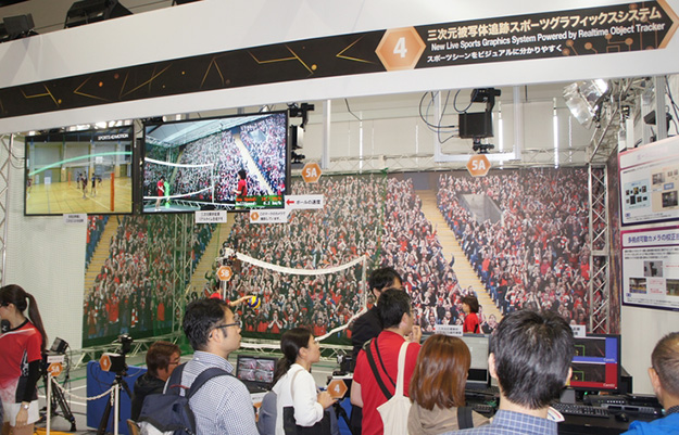 三次元被写体追跡スポーツグラフィックスシステム。ボールの軌跡などをCGで表示することができるグラフィックスシステムで、ボールの三次元位置を高精度かつリアルタイムに算出し、正確なCGの合成を実現している。カメラや被写体が動いても、精度の高い三次元位置算出やCG合成がリアルタイムで実現するよう、複数台の可動カメラの校正技術を開発したほか、処理映像のフレームレートの向上により、従来よりも速い動きのボールを追跡可能
