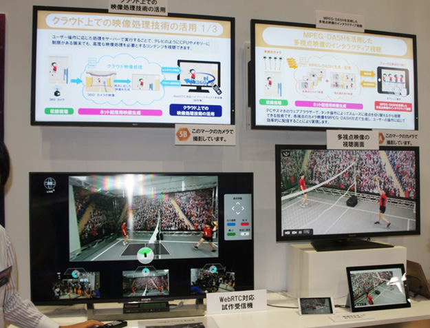インタラクティブな視聴を実現するネットサービス技術。各視点のカメラ映像をMPEG-DASH方式で生成し、PCやスマホのウェブブラウザで、タッチ操作でスムーズに視点を切り替えながら視聴できるもので、テレビのようにCPUやメモリーに制限がある端末でも、高度な映像処理を必要とする360°映像などのコンテンツが視聴可能。ユーザーの操作に応じた映像処理をクラウド上のサーバーで実行し、WebRTC技術によりテレビに伝送することで実現