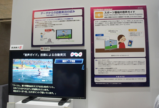 スポーツ番組の音声ガイド。実況や解説のない競技動画に音声ガイドを自動で付与することができ、テレビ音声と音声ガイドの両方を聞くことで、視覚障害者をはじめ、自動車の運転中のように映像が見られない状況にある場合でも番組を楽しめる
