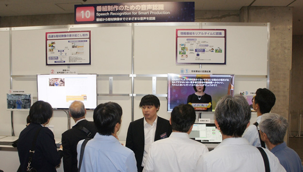 番組制作のための音声認識。明瞭に発声されない音声が多い情報番組をリアルタイムに認識する技術や、取材映像の書き起こしを効率良く制作する技術で、生放送の情報番組への字幕付与、取材映像中のコメントを書き起こすための音声認識技術