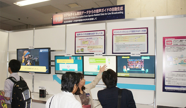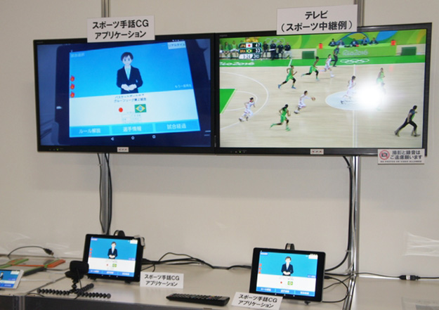スポーツ番組への手話CG自動付与。自動で手話CGを生成する技術で、オリンピックやパラリンピックの競技中に放送局に配信される競技関連データを解析し、試合の状況をリアルタイムに手話CGに変換するとともに、試合経過のダイジェストも生成。タブレット端末やスマートフォンでいつでも手軽にこれらの手話CGが見れる