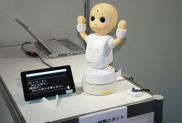 テレビ視聴ロボット。家庭でテレビ番組を一緒に楽しむパートナーとしてのコミュニケーションロボット。ロボットに搭載したカメラとマイクロホンアレーを利用して、テレビと人の位置を検出する環境センシング技術や番組情報と字幕情報から番組に関連の深いキーワードを抽出し、番組に関連する言葉をロボットが自発的に話しかける技術。放送番組を見ているときに、テレビの方向を見ながらつぶやいたり、人の方向を見て話しかけたりする動作を行い、視聴者とコミュニケーションが可能となる