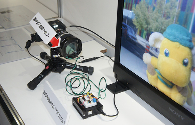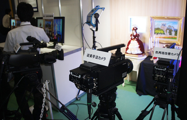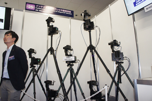 インテグラル立体テレビの要素技術として多視点ロボットカメラによる撮影システムが展示されていた。インテグラル立体テレビの撮影にはほかにも専用のカメラを使う方法もあるが、多視点ロボットカメラであればほかにも使いまわしが可能