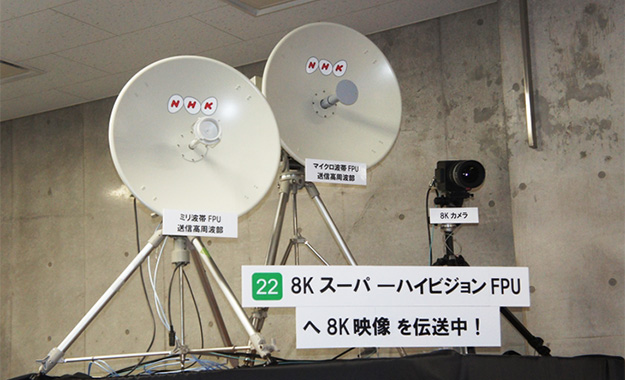 8KスーパーハイビジョンFPU。HEVC/H.265によるエンコーダー・デコーダーを用いたリアルタイム8K伝送システム。6/6.4/7/10/10.5/13GHz帯のマイクロ波帯のハイビジョンFPUと同じ18MHzの帯域幅で周波数利用効率を向上させ、200Mbps級の長距離伝送を実現