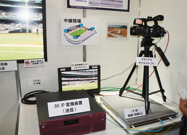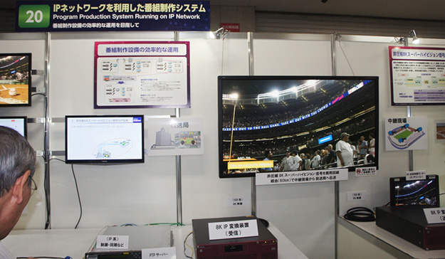 IPネットワークを利用した番組制作システム。8K信号をIPネットワークで伝送するための変換装置や、ネットワーク上の設備をスタジオ間で共有して利用する方式を開発することで、一般のIP専用回線を利用でき、高品質な8K映像を遠く離れた場所からも低コストで伝送が可能