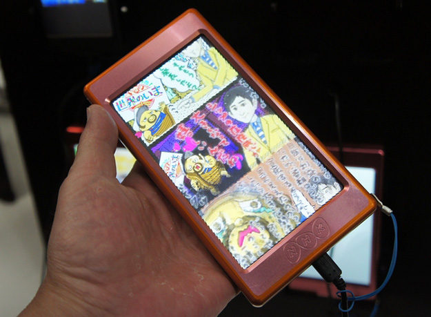 並列型インテグラル立体ディスプレイ。毎年展示しているインテグラル立体ディスプレイだが、今年はスマホタイプのものがいくつかあり、実際に手に取れるようになっていた。最近のスマホはHD解像度のものもかなり一般化し、そうした製品と比べると粗いものの、充分実用の範囲といえる