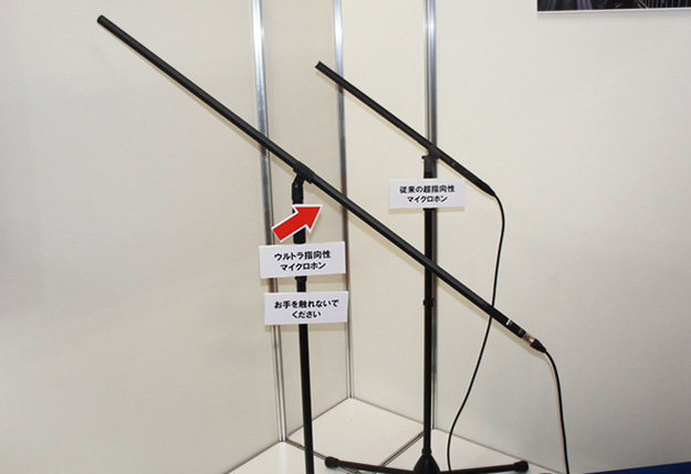 ウルトラ指向性マイクロホン。音響管を高精度に設計するためのシミュレーション技術を開発し、従来のショットガンマイクの音響管を長くすることでさらなる指向性を達成