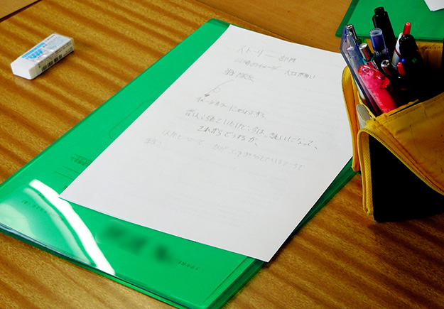 個人で考えたアイデアをもう一度グループで発表した後、アイデアの変更は全く問題ないことを告げるた。すると30秒のCM部門に応募を考えていたグループがストーリー部分に変更したり、その逆もあった。またストーリーの内容を変えて明快なものにしたりと、アイデアを具体化すると様々な問題を解決していかなければならないことに気付いてもらえたようだ。そして、担当の先生による次の授業の時に絵コンテが描けるようにして欲しい旨を伝えた。