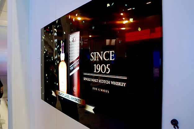 例えばLGの超薄型OLEDディスプレイ。「ウォールペーパー サイネージ」と名付けられた55インチのOLEDは、その厚さわずか3.65mm(OLEパネル自体は0.97mmしかない)、ベゼル厚1.2mmの超薄型、超狭額である。これは数字以上に実際に壁面に設置するとかなりのインパクトがある。インパクトというのは、空間に溶け込むというかディスプレイの存在を忘れさせるものだ。
