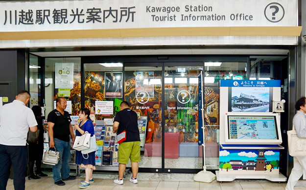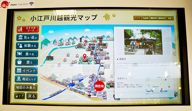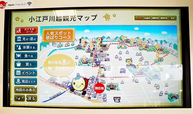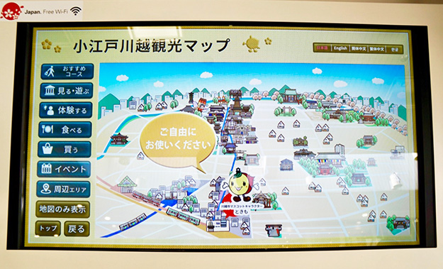 この端末の設置場所は観光案内所のすぐ前なので、より詳細なことを知りたい場合はそちらに行けるし、すぐ横には印刷された周辺地図も置いてある。最近川越には観光客が非常に増えているので、ここの案内所は常に混雑している。そのため対面だけでなくこの端末でも案内をするとことにも意味がある。