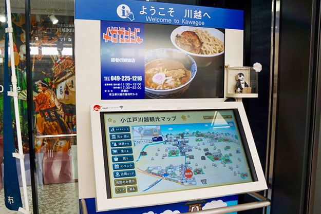 この川越の観光サイネージは、表示灯株式会社によって設置運営されている。設置場所は東武東上線の川越市駅の改札を出たところだ。上部にあるディスプレイは広告専用で、下の部分にタッチパネルディスプレイが設置されている。同社はもともと駅前地図を広告媒体化していた会社で、地図の設置費用を負担する代わりに広告媒体化して運営するという事業モデルである。