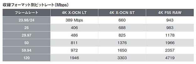 後田氏:例えば4K SQ-RAWでしたら、1枚のフレームは約5MBのデータ量になります。一方X-OCN STの場合は3.5MB、LTの場合は約2MBのデータサイズ。フレームレートが上がっても、それぞれ1枚のデータサイズは一定なので、フレームレートに応じてデータレートが上がることになります。