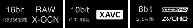 まず、X-OCNの立ち位置を説明しておこう。ソニー社製カメラがサポートする記録フォーマットは、8bitのAVCHDとMPEG HD、10bitのXAVC、16bitのRAWまで幅広い。このうちX-OCNは、RAWと並ぶ16bitの階調を持つ。