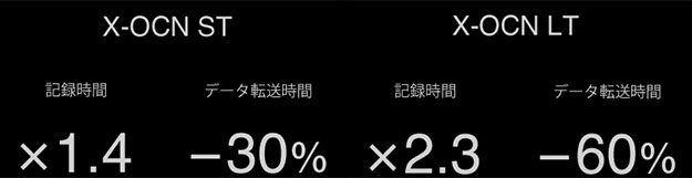 X-OCNは、2つの記録モードを持っている。RAWと遜色なく扱えるX-OCN STと、よりコストパフォーマンスを追求したX-OCN LTだ。ファイルサイズとしては、RAWに対してSTは30%削減、LTは60%もの削減となる。