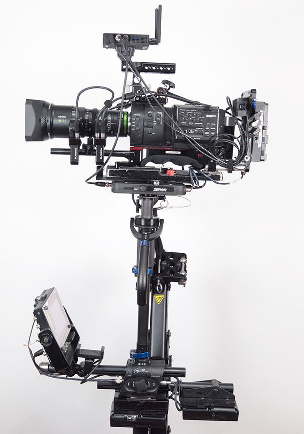 筆者所有のステディカムZephyrに、PD Movieの3モーター+FS700+SHOGUN INFERNO+MK18-55+CW-3の組み合わせを搭載。シネマレンズと3モーターのシステムが、中級機ステディカムに搭載できることに驚いた