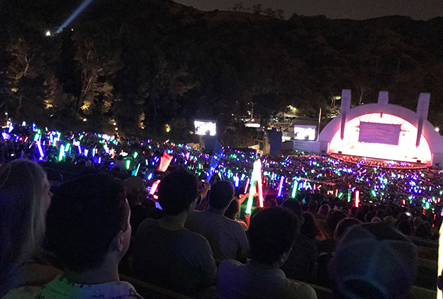 ジョン・ウィリアムズによれば、観客席でライトセーバーが乱舞するこの光景は、ハリウッド・ボウルで「自然発生」した、ここでしか見られない風物詩なのだそう。当初、ライトセーバー持参者はごく少数だったのが、毎年どんどん増え続け、とうとう観客の大半が持参するようになってしまった(笑)。今ではコンサート当日に売店でもライトセーバーが販売されるようになり、LAフィルのメンバーまでステージ上からライトセーバーを振りかざしていたのが印象的であった。