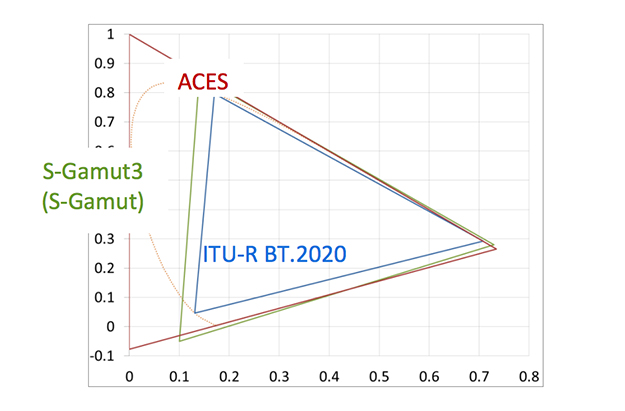 遠藤氏:シネマカメラセンサーの色域はTVの709や、DCIのP3よりもずっと広い色域を意図して設計されています。S-Gamutは、そのデータを効率よくポストプロダクションで利用してもらうために、S-Log2提案時に一緒に提案をしたものです。