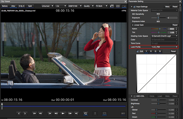 遠藤氏:LUTを使った変換方法から紹介します。右にある「Look Profile」には「LC_709」「LC_709TypeA」「SLog2_709」「Cine+709」などのLUTを収録しています。709の制作なら一番上の「LC_709」を選択します。これを選択すると色もそれなりに乗ってコントラストも高くなり、なおかつ白飛びしていない状態になります。