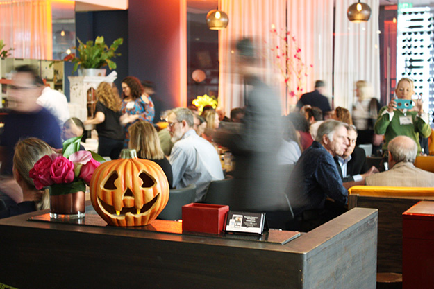 ソフィテルロサンゼルスホテルのレストランとテラスで、バフェ形式ランチが無料提供された。参加者同士で談笑しながらのランチ。開催日はハロウィン直前という季節柄もあり、レストラン内にはハロウィンらしいデコレーションも。