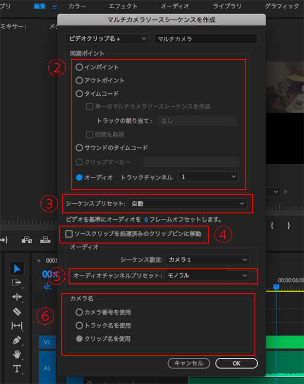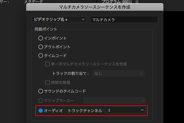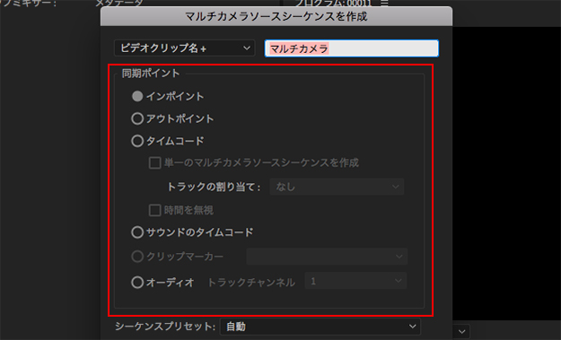 - 「マルチカメラソースシーケンスを作成」パネルの「同期ポイント」を選ぶ
