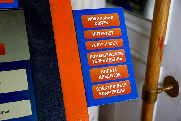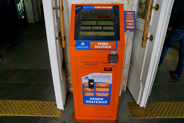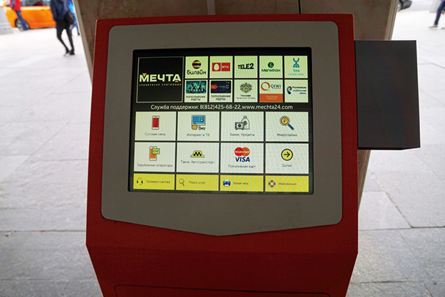 最初はモスクワ鉄道会社のベラルーシスカヤ駅にあった端末だ。上部に15インチほどのタッチパネルがあり、右横にはICカードのリーダー、筐体下部には紙幣挿入口とプリンターがある。タッチパネルの上段はさまざまな決済機能へのボタンで、携帯電話事業者、インターネット決済事業者のサービスや、交通カードのチャージなどが利用できる。中段は左上から順に、モバイル通信、インターネットとテレビ、銀行・クレジット、マイクロローン、外国人向けサービス、タクシー・乗り物となっているが、タッチしてもほとんど内容が理解できないもの、動作しない項目もいくつかあった。下段は支払い確認、サービス検索、プリント、インフォメーションとなっている。言語対応はロシア語のみである。