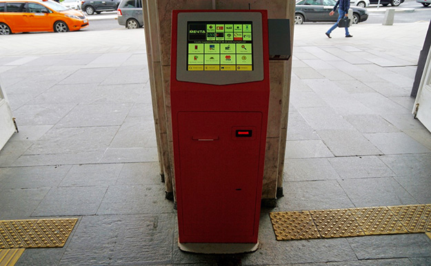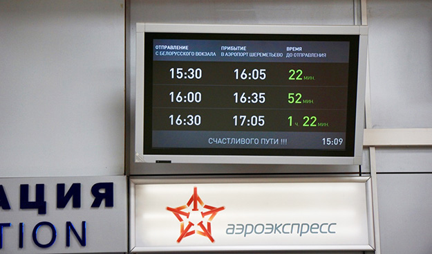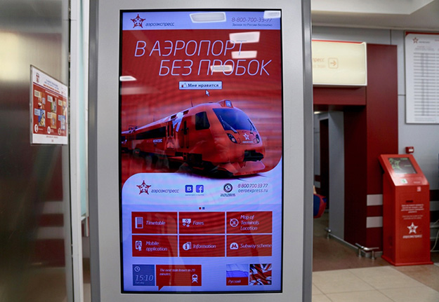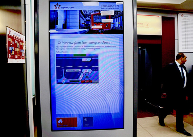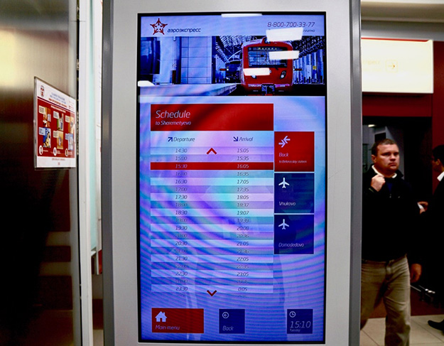 最後は市内中心部と空港を結んでいる、アエロエクスプレスのベラルーシスカヤ駅に設置してある端末だ。正立型で50インチほどのタッチパネルディスプレイだ。ロシア語と英語に対応している。メニューはシンプルで、時刻表、料金表、駅のマップなどである。時刻表は現在時刻以降の出発と到着の時刻が表示される。実際の運行情報に連動しているわけではない。動作は軽快であった。