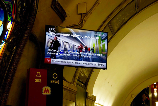 筆者が乗車したのは、山手線のようにモスクワ中心部を一周りしている環状線である。駅は中央にホールがあり、左右にプラットフォームがある。このホール部分の片方だけにエスカレーターがあり改札口に繫がっている。このエスカレーターの登り口側に、50インチほどの横型のディスプレイが設置されている。別の駅では、ホールの中央付近に真ん中にかなり高いポールの上に設置されている。筆者が乗降した環状線6駅くらいではこれ以外の設置方法は見られなかった。モスクワ地下鉄環状線の構内は、美術館とも言われるほど彫刻やモザイクによって装飾されているが、アナログの広告も掲示されていない。そのために視認性は極めて高い。