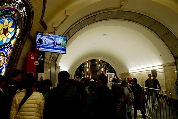 はじめにモスクワの地下鉄のデジタルサイネージを紹介する。モスクワの地下鉄は非常に深いところを走っていて暗い、などという噂も耳に入っていたが実際にはそれほどでもない。東京の一部の地下鉄路線のほうが遥かに深いところを走っているものもある。