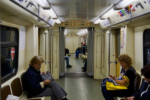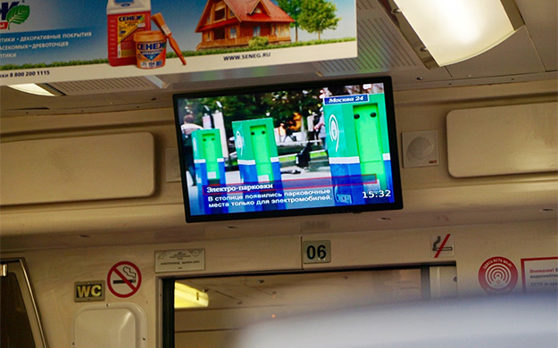 表示内容は「MOSCOW24」というローカルテレビ局が制作している、放送とは別のサイネージ用のコンテンツである。画面は3分割表示されており、上段は静止画によるニュースで写真とテキストによるスライドショーだ。中段は別の文字ニュース、下端はモスクワ地下鉄公社からの運行情報を含めた情報がテキストで表示されていた。車両の中にもやはりMOSCOW24を表示するディスプレイがドア上部分に設置してある。このディスプレイは後付けのもので、駅とは若干表示形式が異なっている。行き先案内は別にLEDによる文字表示がある。地下鉄に関しては駅、車両ともにコンテンツはMOSCOW24のニュースのみで、広告利用は今回確認できなかったのはちょっと意外であった。