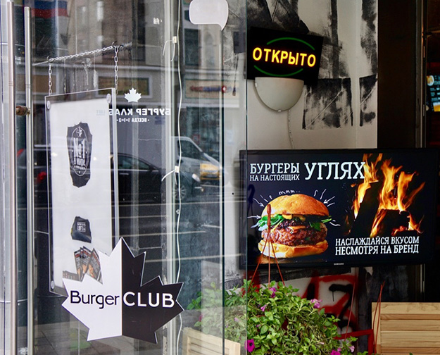炭火焼きをアピールするハンバーガーショップの店頭サイネージ