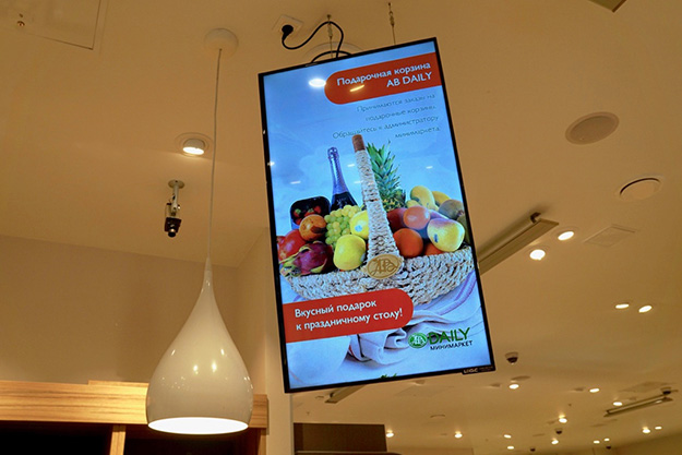 コンビニにもデジタルサイネージが設置されていた。これは「AB Daily」という都市型のコンビニ。コンビニというよりはどちらかと言うと食料品が中心のミニスーパーにと言ったほうがいいかもしれない。ここのレジ上に42インチディスプレイが全部で2面、縦に天井から吊られているのだが、この設置方法が興味深い。天井から2本のワイヤーが出ていてそれだけで固定されており、かつワイヤーだけで微妙に角度まで付けてある。いくらディスプレイが軽量化したといえども日本ではありえない設置方法だと思う。コンテンツ内容は自社の販促情報だった。