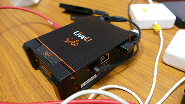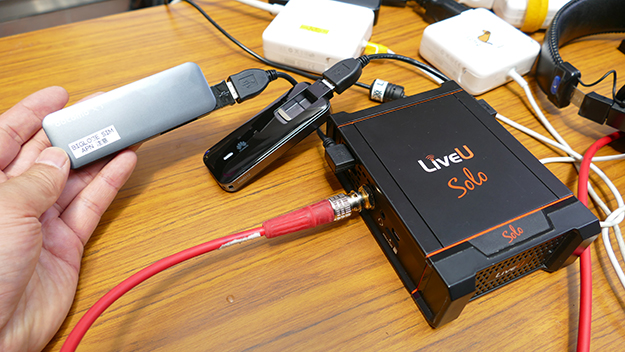 ライブ配信の前提として専用の有線LANを確保することは最優先事項ですが、会場側の条件や時間的な問題から使えないことがあります。そんな時に複数のLTE対応USBモデムを束ねて映像をクラウドに送り込みそこから配信サービスに配信する「LiveU」が頼りになります。こうしたサービスには現場から映像を送出して受信するスポットにも人が必要なタイプと現場からクラウドを介して直接配信サービスに送り込むタイプがあります。「LiveU Solo」は後者のタイプで現場の配信スタッフのみでオペレーション出来るのが特徴です。