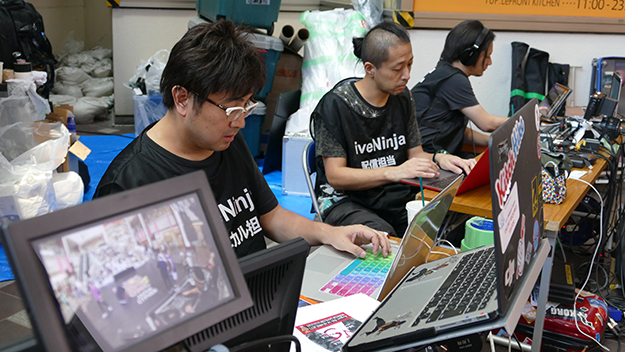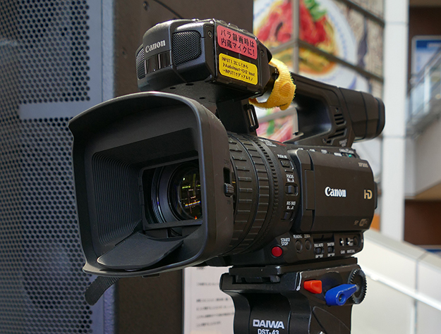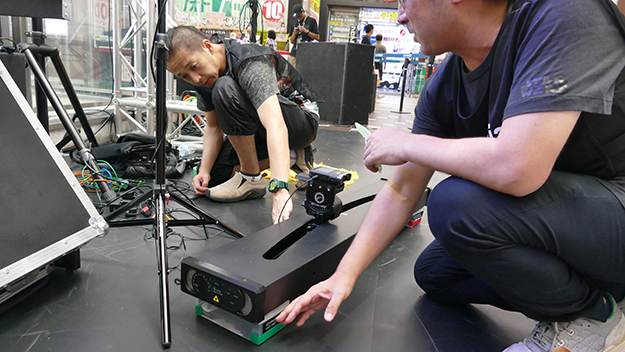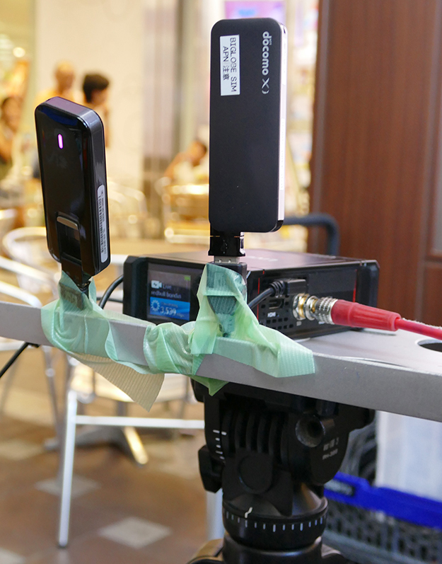 こうした通信装置を使う場合に重要なのが電波をつかみやすい位置に機器を設置することです。ノートPC用のプレートをつけた三脚に、本体とLTE対応USBモデムを設置して高めの位置に設置して回線速度が出る位置を探り設置します。公共空間では通信速度も変化しますがその中でもベストな位置を限られた時間で探します。映像ケーブルはHD-SDIである程度延長できるので、通信装置は見通しがよく電波の受信感度のよい場所に設置しましょう。今回はLiveU社から借りた機材そのままの仕様で使っていますが、LTE対応USBモデムであればUSBケーブル部分を延長してアンテナのように高い位置に設置することも出来ます。