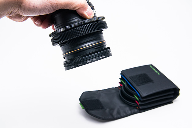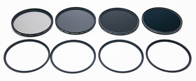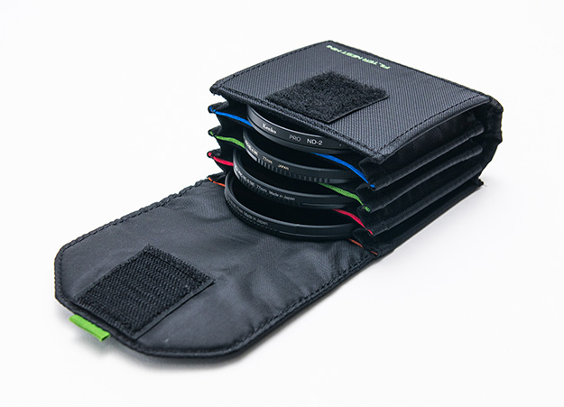 現場にはND2、4、8、16の4枚セットを持参して、各々を組み合わせて使用している。マグネットホルダー付きの状態でも、愛用のMindShift製のフィルターポーチに綺麗に収まった