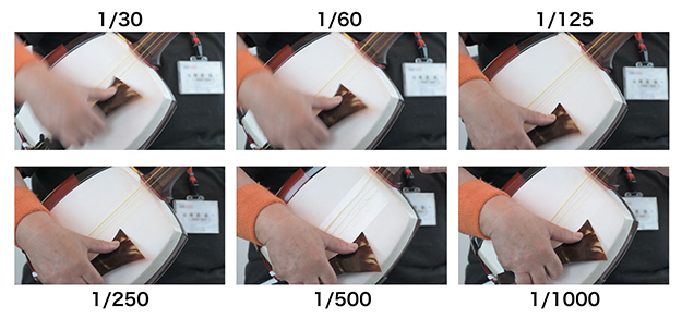 露出が一定なる様にISOを変えながら、シャッタースピードを変化させた例だが、撮影は4K30Pで1/125以上では1コマ1コマが止まった様に見えて、動画としては違和感がある。三味線の撥の動きはかなり早いので、1/125でも少し残像を感じるが、動画の1コマとしてはそれでも違和感を感じるし、1/250以上は完全にアウトだ。