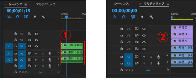 下の画面の(2)を見ていただくとマルチとして組んだ中身がどうなっているかが一目でわかりますね。例えば「V2」トラックのタイミングが他と合っていないという場合は「V2」に配置されたクリップを修正すれば良いということになり、非常に組んだ後も修正がしやすい状態なのが特徴です。この設定はタイムライン上のマルチクリップを直接Controlキーを押しながらクリック(Mac)/右クリック(Windows)することでも直接編集することが可能なので便利です。