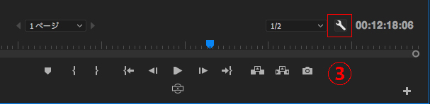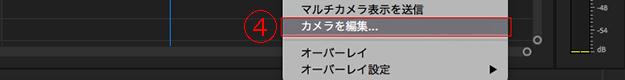 一度、マルチクリップを組んだ後にマルチの表示の順番を変えたい場合はプログラムモニターにあるスパナのアイコンの「設定」(3)から「カメラを編集」(4)を選択します。