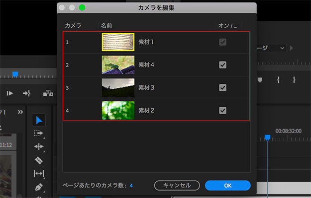 カメラを編集に入ると上から順番にアングルがリスト化されているので、そのサムネールを上下に移動することでアングルの順番を切り替えることが可能です。また。左下の「ページあたりのカメラ数」ダイアログで、ページごとのカメラソース数を設定するかをコントロールできます。