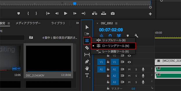 「ローリングツール」を使えば2つのクリップ間の編集ポイントをロールすることが可能