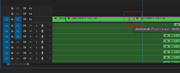 一度切り替えたクリップ間の編集点を修正する場合は「ローリングツール」で修正します。編集点を前後にドラッグすると一括で前のクリップと後ろのクリップのタイミングを変更できるので、使いやすいです。ショートカットは「N」キーになります。