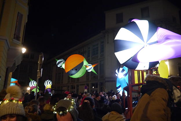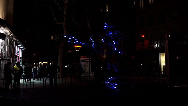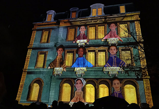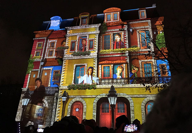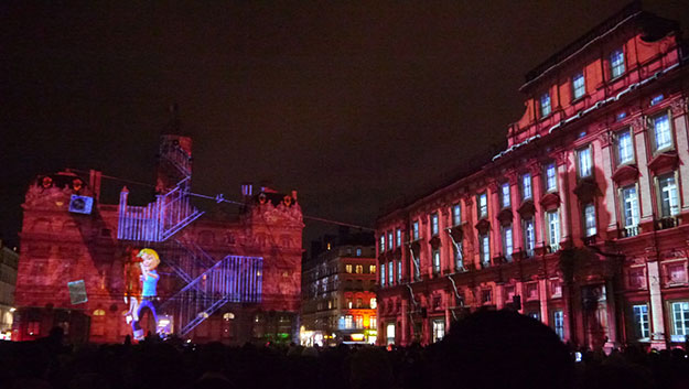 古い建物(4階建)を使ったプロジェクションマッピングの作品で、子供達が製作に携わっているという異色の試み。リヨンの伝統的な人形劇の手法を用い、そこにやはり地域の童話を題材にした紙芝居の様な作品に仕上げている。祭典に地元の文化や子供達を取り込んだ試みがあるというのは、祭典の地域性と幅を広げる意味でもとても意義がある。